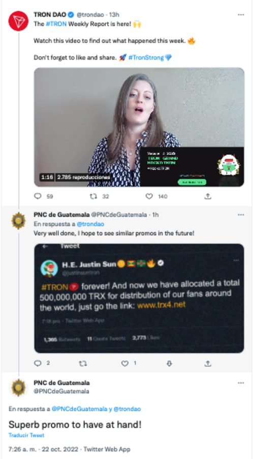 ¿Qué les pasó? La cuenta de Twitter de la Policía Nacional Civil (PNC) escribió una respuesta a un video de la cuenta Tron Dao, radicada en Dominica.