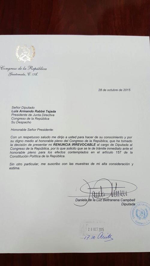 Beltranena presentó su renuncia a la Dirección Legislativa a las 18 horas con 15 minutos de este miércoles, para agilizar el trámite, luego fue enviada a la Junta Directiva y fue el tercer vicepresidente, Selvin García, quien confirmó la dimisión.
