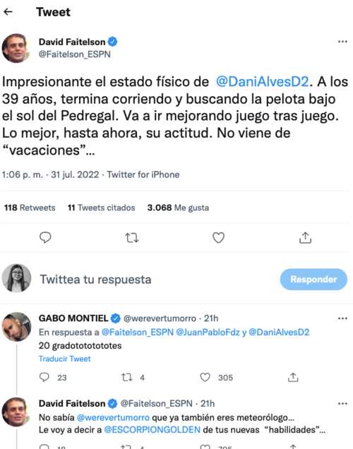 "Impresionante el estado físico de Dani Alves. A los 39 años, termina corriendo y buscando la pelota bajo el sol del Pedregal. Va a ir mejorando juego tras juego. Lo mejor, hasta ahora, su actitud. No viene de vacaciones", escribió Faitelson en su cuenta de Twitter.
