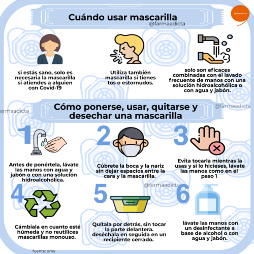 La Organización Mundial de la Salud (OMS) explica que "el uso de las mascarillas sólo será eficaz si se combina con el lavado frecuente de manos" con alcohol en gel o agua y jabón.