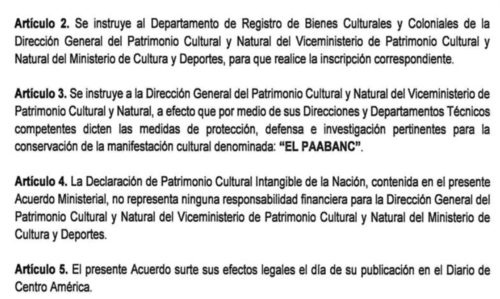 El Ministerio de Cultura y Deportes publicó este jueves en el Diario de Centro América la declaratoria como Patrimonio Cultural Intangible de la Nación El Paabanc. Bajo el acuerdo ministerial 808-2022 Cultura y Deportes declaró El Paabanc como patrimonio nacional debido a su valor cultural, artístico e histórico en el país.