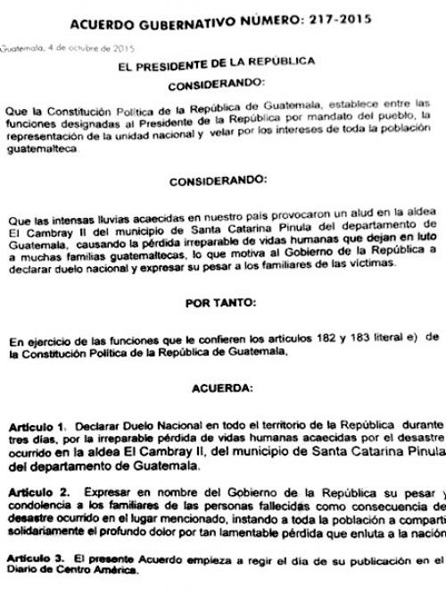 El Gobierno de la República, a través del Acuerdo Gubernativo 217-215, publicado este lunes en el Diario oficial, declaró tres días de Duelo Nacional por las víctimas del alud ocurrido en la comunidad El Cambray II, Santa Catarina Pinula, en el que además expresan sus condelencias a los afectados por el deslizamiento.