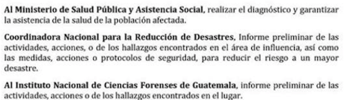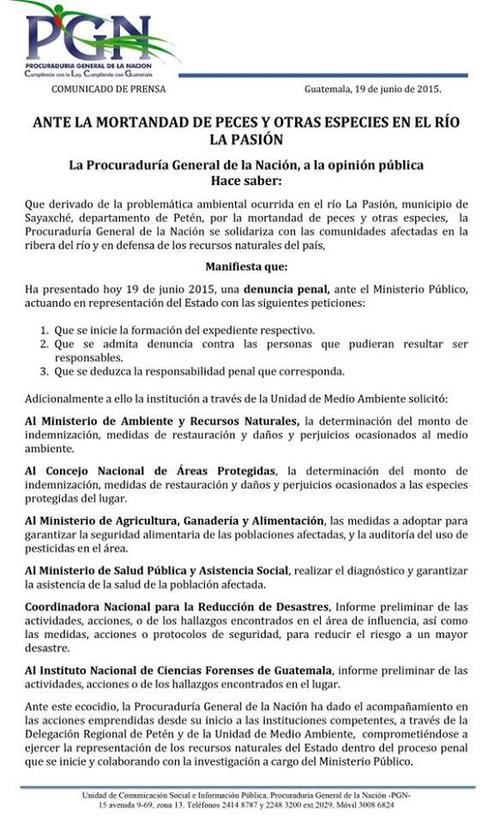 Además en su comunicado la PGN instó al Ministerio de Medio Ambiente (MARN) y el Consejo Nacional de Áreas Protegidas (CONAP) que determinen el monto de la indemnización y medidas de restauración del ecosistema.