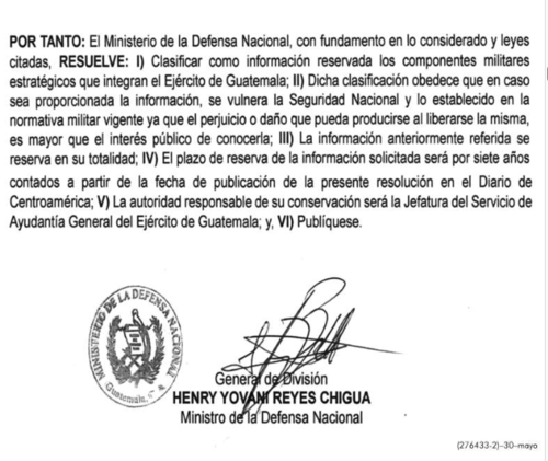 Una resolución del Ministerio de la Defensa Nacional (Mindef) publicada este martes 30 de mayo en el Diario de Centro América, declaró la reserva la información relacionada con el Ejército de Guatemala por un período de por 7 años.