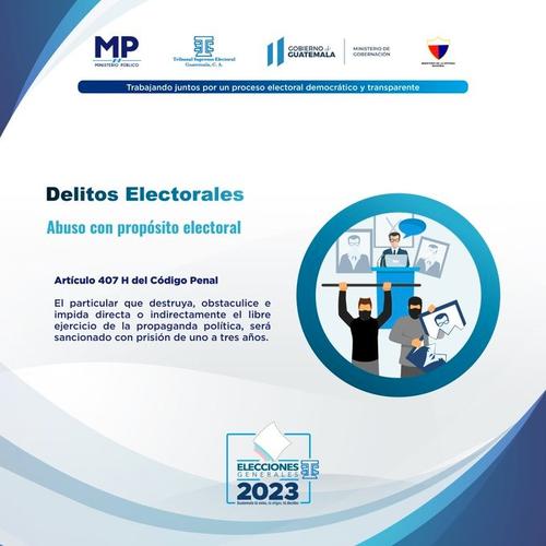 Según el Artículo 407 "H" del Código Procesal Penal: "Abuso con propósito electoral" se lee: "El particular que destruya, obstaculice e impida directa o indirectamente el libre ejercicio de la propaganda política, será sancionado con prisión de uno a tres años".