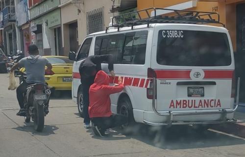 Usuarios en redes sociales captaron el momento en que dos personas rotulaban un microbús con insignias de ambulancia, en un sector de la zona 1 capitalina.