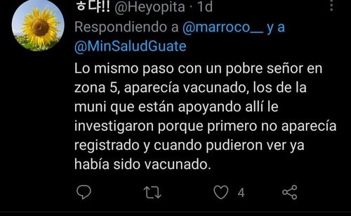 “En el Naranjo la chava fue buena onda, pasó como media hora viendo por qué el sistema no me jalaba. Hasta que se dieron cuenta que ya salgo vacunada por el IGSS, y yo jamás me he vacunado”, explicó la afectada.