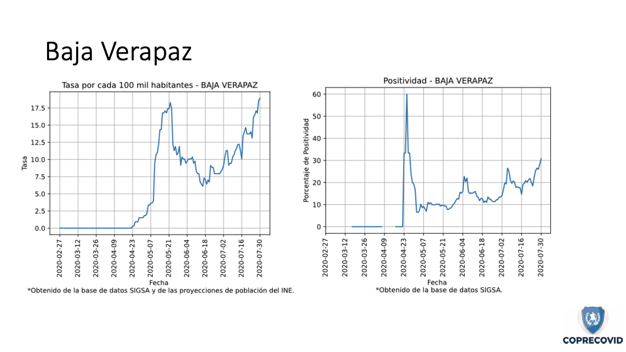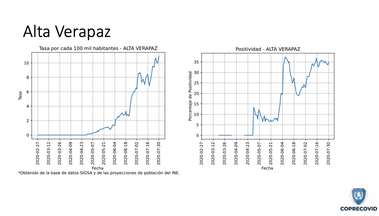 Según el Tablero Covid del MSPAS, Alta Verapaz tiene un total de 500 casos acumulados, un una tasa de incidencia del 37.6 personas por cada 100 mil habitantes. Los municipios con mayor número de contagios son Cobán, con 187 positivos; San Pedro Carchá, 39; Chisec, con 35; y San Juan Chamelco, con 33.