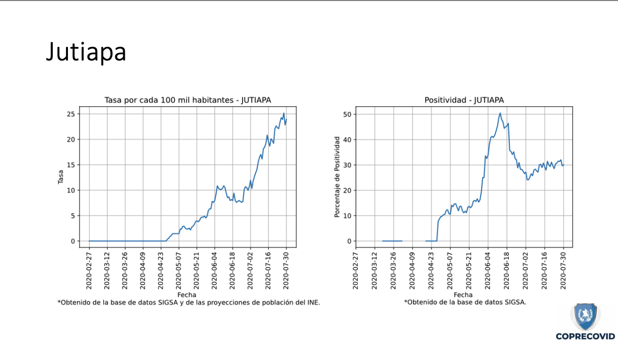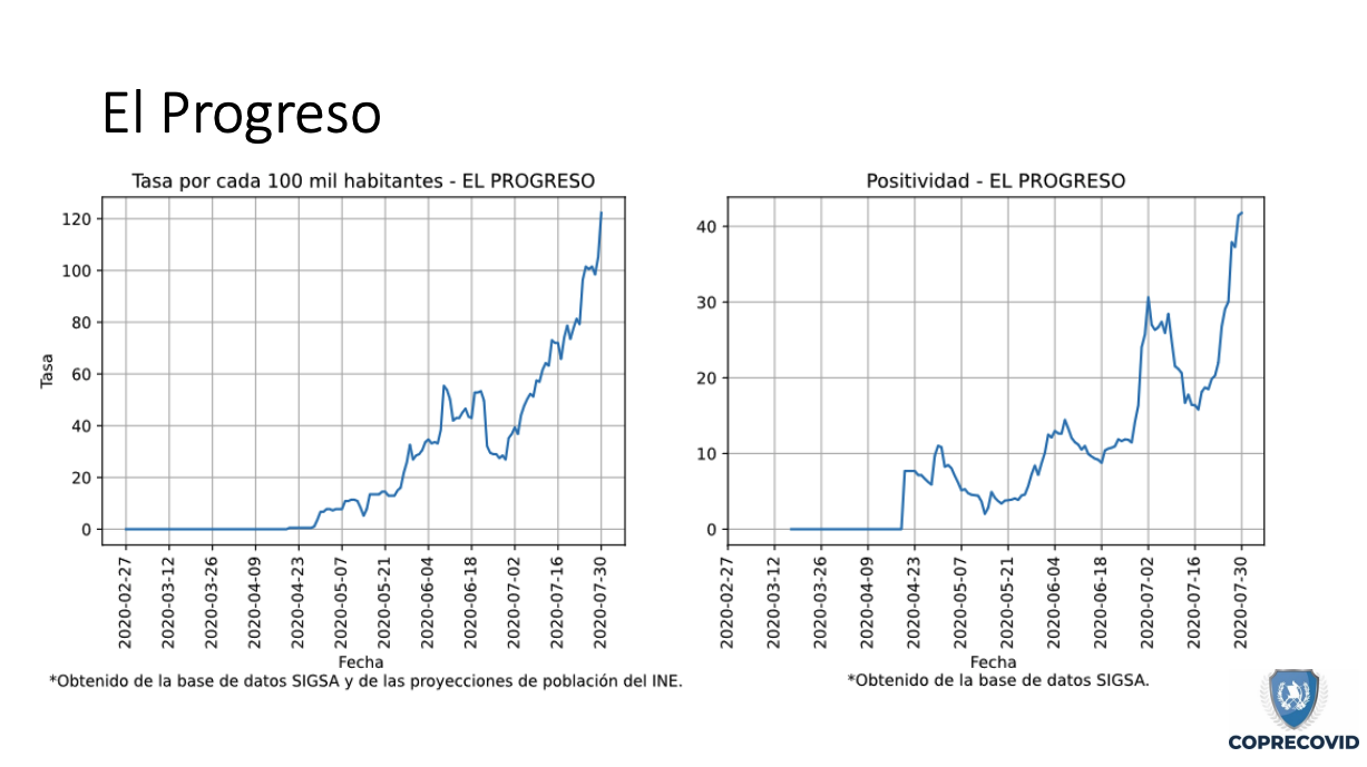Esta misma situación ocurre en El Progreso, donde el número de contagios va hacia el alza. En la actualidad se reportan 788 casos y una tasa 408.1 positivos por cada 100 mil habitantes. Los municipios más graves son San Agustín Acasaguastlán, con 199; Guastatoya, 173; y Sanarate, 51.