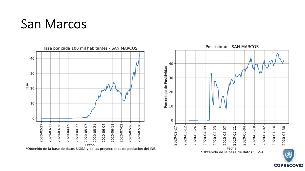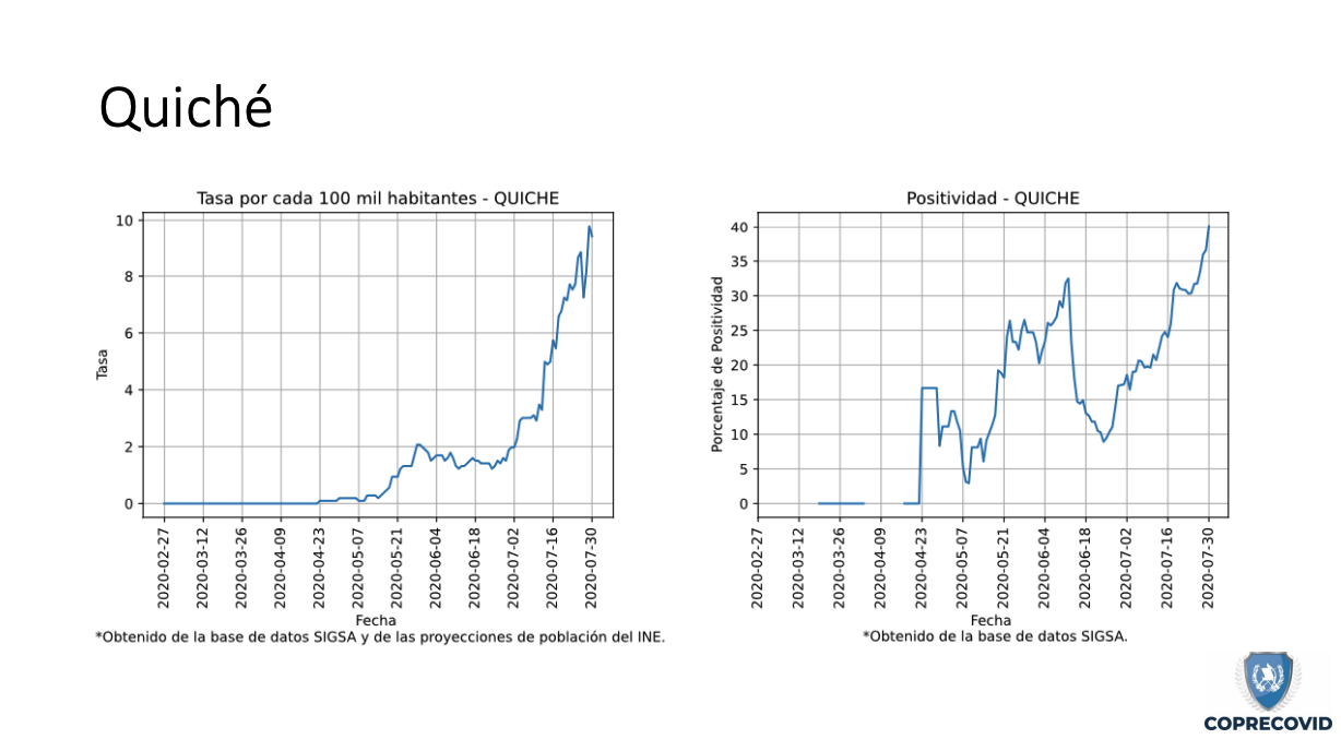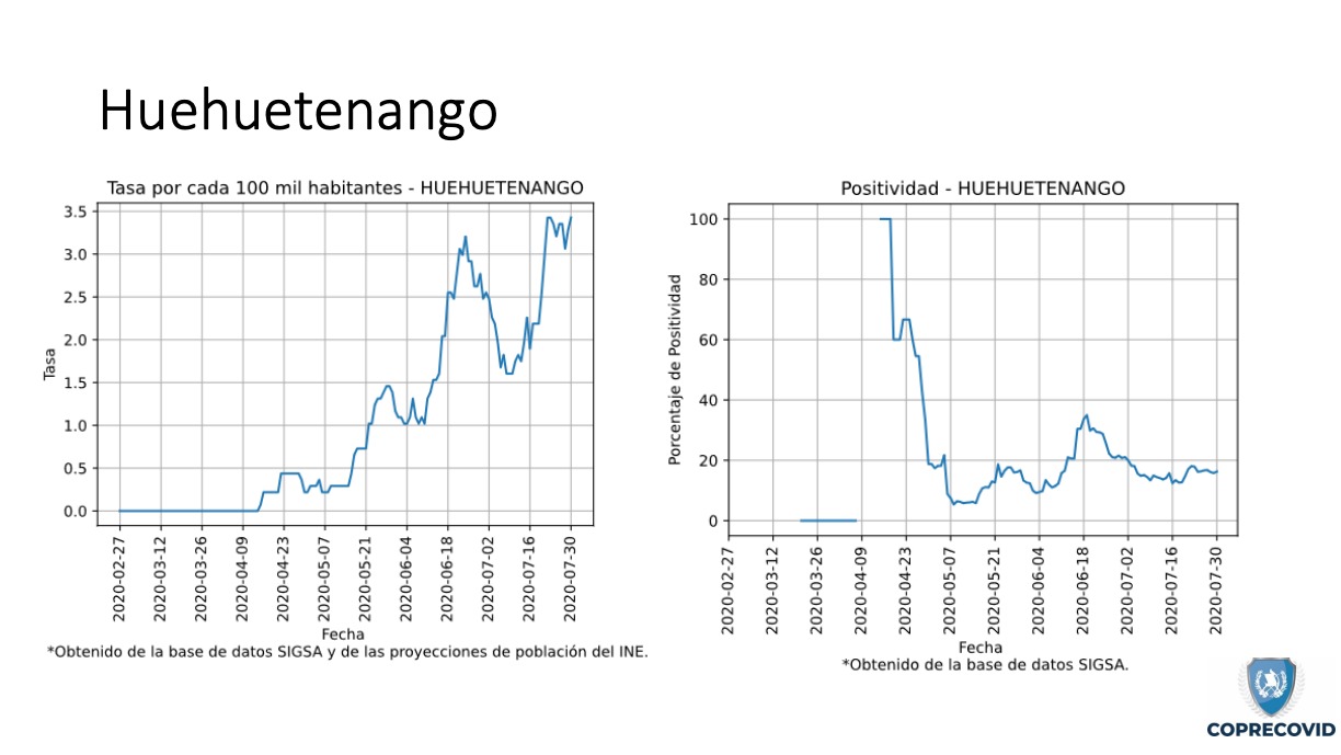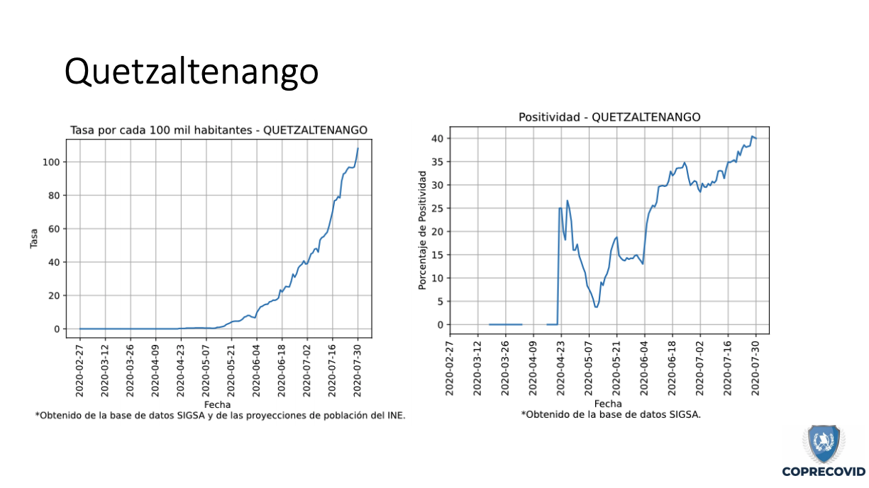 Uno de los más afectados y que las mismas autoridades han reconocido que tiene un alza en los contagios es Quetzaltenango. Hasta el 4 de agosto se reportaban 2,648 casos positivos con una tasa de incidencia de 295.4 por cada 100 mil habitantes. Los municipios más graves son la cabecera departamental con 1,421 pacientes; Coatepéque, 390; y Olintepéque con 93.