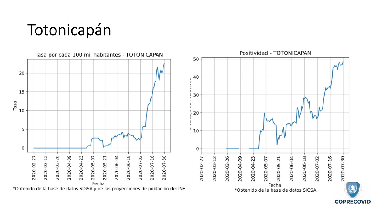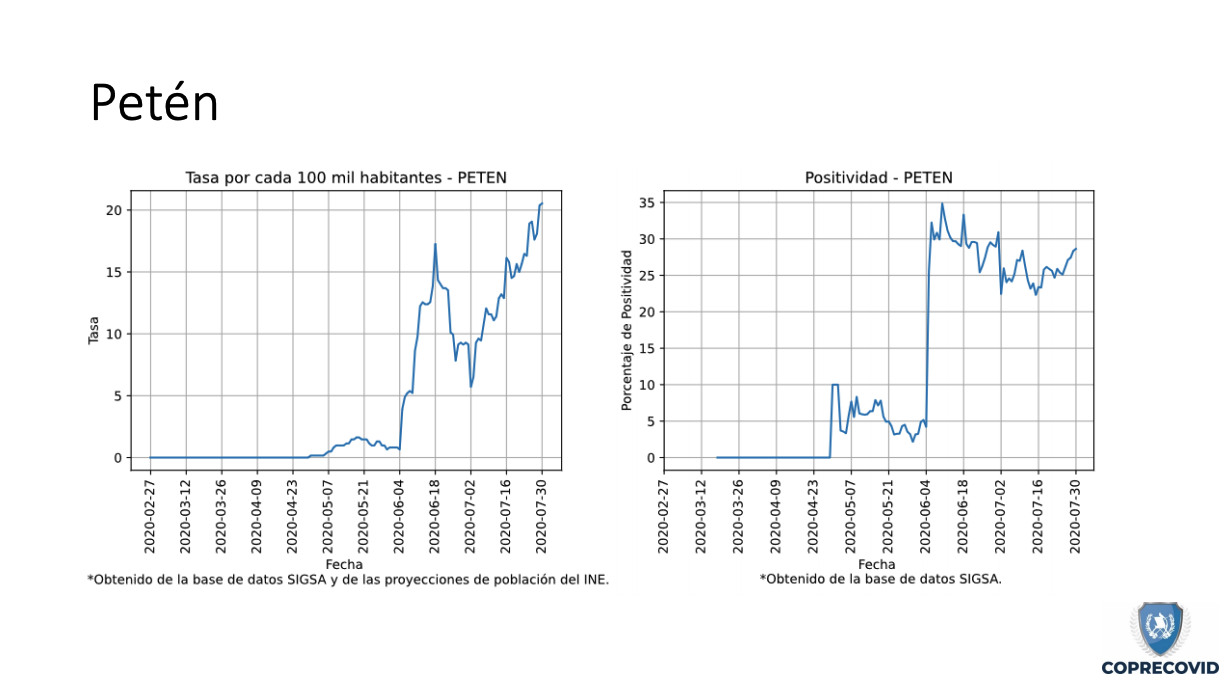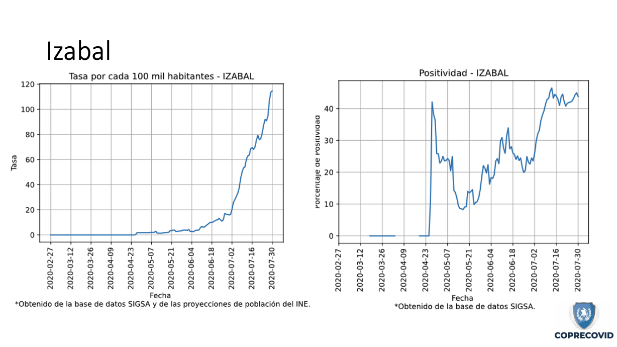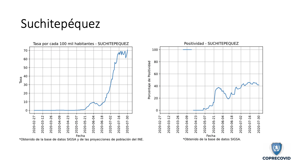 Uno de los más afectados y que las mismas autoridades han reconocido que tiene un alza en los contagios es Quetzaltenango. Hasta el 4 de agosto se reportaban 2,648 casos positivos con una tasa de incidencia de 295.4 por cada 100 mil habitantes. Los municipios más graves son la cabecera departamental con 1,421 pacientes; Coatepéque, 390; y Olintepéque con 93.