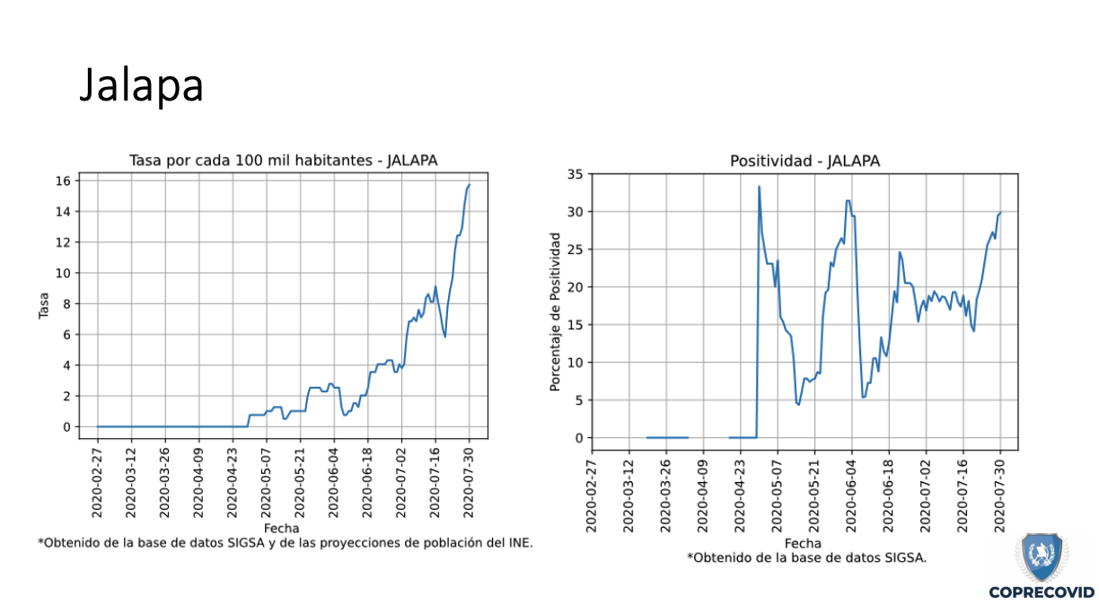 Jalapa reporta 159 casos de Covid-19 acumulados, con una incidencia de 43 positivos por cada 100 mil habitantes, de acuerdo con el Tablero del Ministerio de Salud. Los municipios más afectados son la cabecera con 121 pacientes, le sigue Mataquescuintla, con 16 y San Pedro Pinula, 9.
