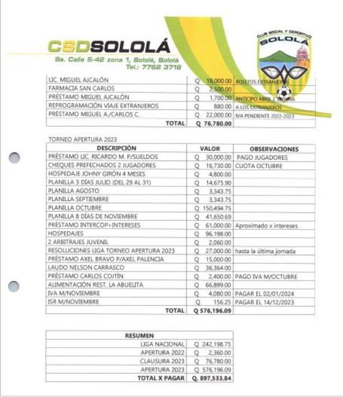 Y las deudas del 2023 se añadirán a las del 2024, ya que del último torneo disputado, que finalizó el pasado 23 de diciembre, el Deportivo Sololá debe más de 500 mil quetzales (Q576,197.00).