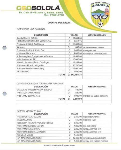 Posteriormente, del Torneo Apertura 2022, ya en la Primera División, el Deportivo Sololá aún tiene una deuda de Q2,360.00 por un préstamo, gaseosas en la presentación del equipo y medicamentos.