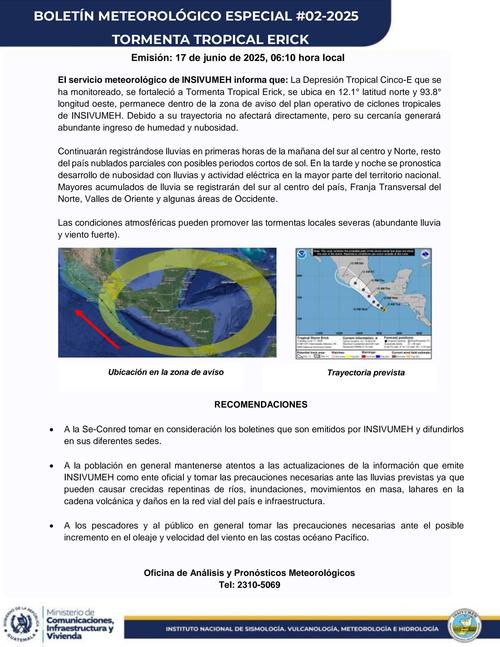 Este martes 17 de junio, por medio del boletín del Instituto Nacional de Sismología, Vulcanología, Meteorología e Hidrología (Insivumeh) se destaca el reciente fortalecimiento de la Depresión Tropical Cinco-E, que ahora fue clasificada como Tormenta Tropical Erick.