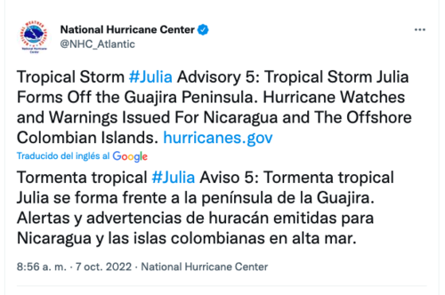 La depresión tropical 13 se convirtió este viernes en la tormenta tropical Julia frente a la Península de La Guajira en Colombia, mientras sigue su avance por aguas del Caribe rumbo a las costas de Nicaragua y se espera que se expanda hacia Guatemala.