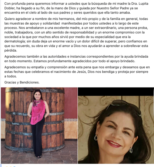 "Con profunda pena queremos informar a ustedes que la búsqueda de mi madre la Dra. Lupita Dobler, ha llegado a su fin, de la mano de Dios y guiada por Nuestro Señor Padre ya se encuentra en el cielo al lado de sus padres y seres queridos que ella tanto amaba", escribió Alondra en Facebook.