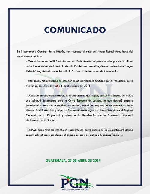El pasado 21 de marzo, la PGN solicitó a los responsables del Hogar Rafael Ayau la entrega del inmueble referido con el argumento de "vicios legales" en el usufructo de 50 años que le fue otorgado en 1996.