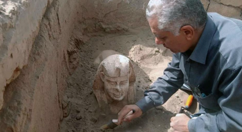 La esfinge fue localizada prácticamente intacta mientras los expertos hacían una limpieza en el campo de excavación. Esta lleva un tocado funerario que es conocido como "Nemes" y que posee una cobra en la frente.