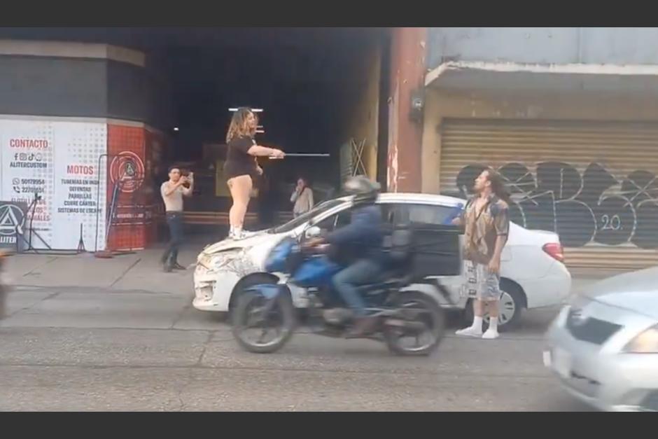 Mientras tanto, el hombre responde: "era de mi amigo, era de mi amigo nena", "estas loqueando". Unos instantes después la mujer sube al capó del carro y continúa la pelea.