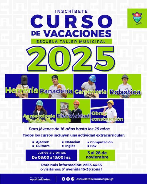 Si tienes entre 16 y 26 años, únete al curso de vacaciones de la Escuela Taller Municipal 2025, organizado por la Municipalidad de Guatemala.