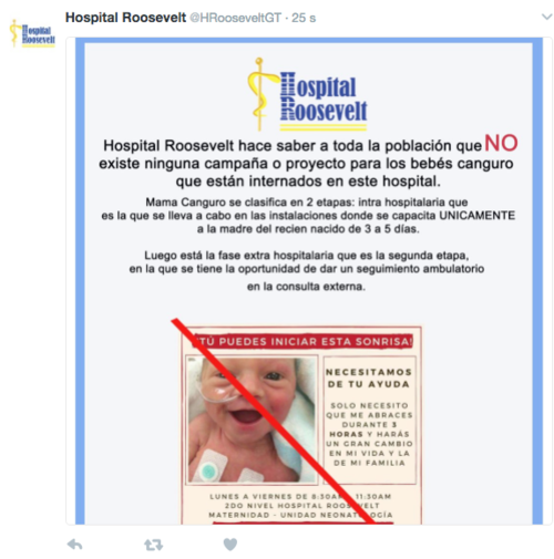 En redes sociales circula una imagen de un llamado Proyecto Kanguro, en el que personas particulares podrían abrazar durante tres horas a bebés prematuros en el Hospital Roosevelt.