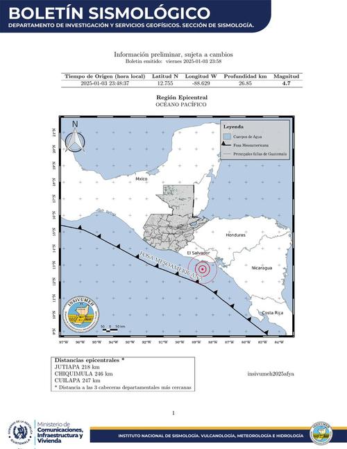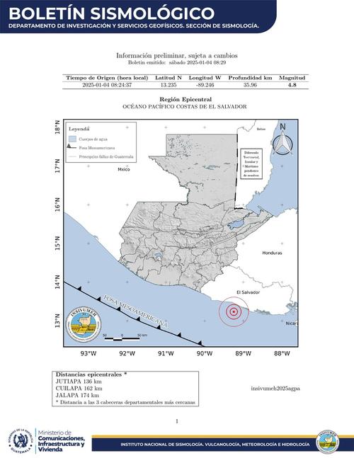 En esta mañana de sábado 4 de enero de 2025, el Instituto Nacional de Sismología, Vulcanología, Meteorología e Hidrología (Invisumeh) reportó un temblor de magnitud 4.8 en el océano Pacífico, en costas de El Salvador, que también fue sensible en Jalapa, Jutiapa y Cuilapa.