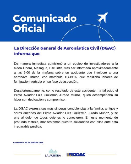 La Dirección General de Aeronáutica Civil (DGAC) emitió un comunicado luego de que una avioneta se desplomara en la aldea Obero, en Masagua, Escuintla, en donde falleció el piloto de la misma.