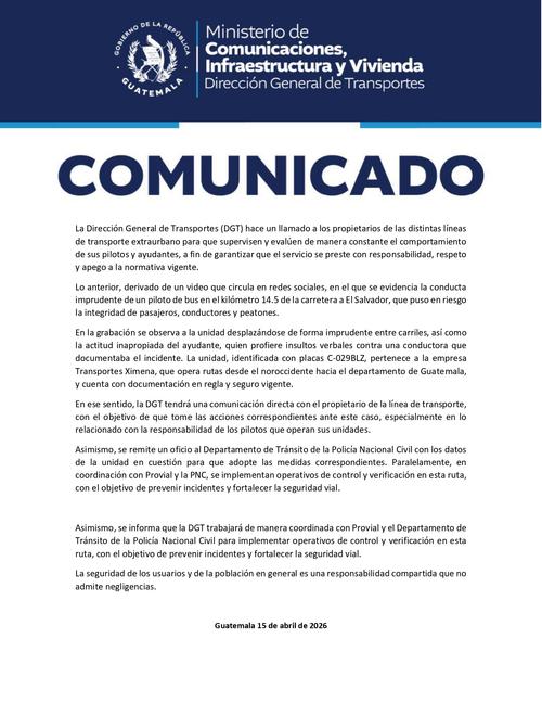 El mismo fue publicado este miércoles 15 de abril, luego de que surgiera un video en donde se observa un autobús de Transportes Ximena, con placas de circulación C-029BLZ, el cual es conducido de forma imprudente en el kilómetro 14.5 de carretera a El Salvador.
