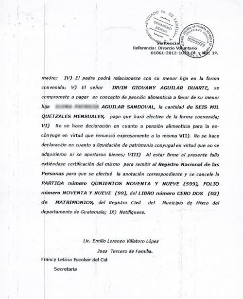 El Juzgado Tercero de Familia autorizó la separación y ordenó que Aguilar Duarte pagara una pensión alimenticia mensual de seis mil quetzales para cubrir los gastos de su hija, quien actualmente tiene seis años.