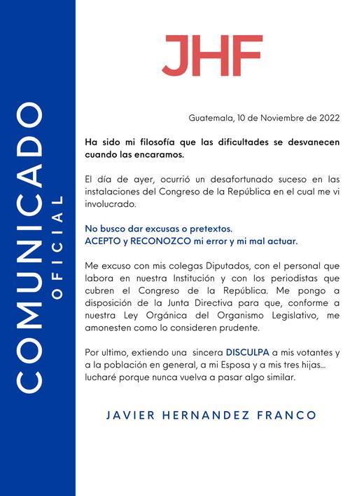 "El día de ayer ocurrió un desafortunado suceso en las instalaciones del Congreso de la República en el cual me vi involucrado. No busco dar excusas o pretextos. ACEPTO y RECONOZCO mi error y mi mal actuar. Me excuso de mis colegas diputados, con el personal que labora en nuestra institución y con los periodistas que cubren el Congreso de la República.