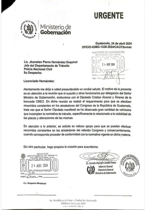 La solicitud se realizó a través del Oficio IGMG-1338-2024 firmado por el inspector General de la PNC, Conrado Catalán.