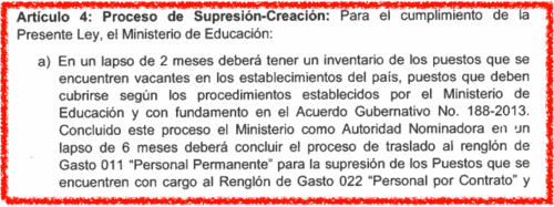 Ocurrido ello, la cartera tendría otros seis meses para hacer el traslado de los docentes contratados al renglón permanente. Un plazo igual se otorgaría para llevar a cabo los procedimientos correspondientes en la Oficina Nacional de Servicio Civil (Onsec).