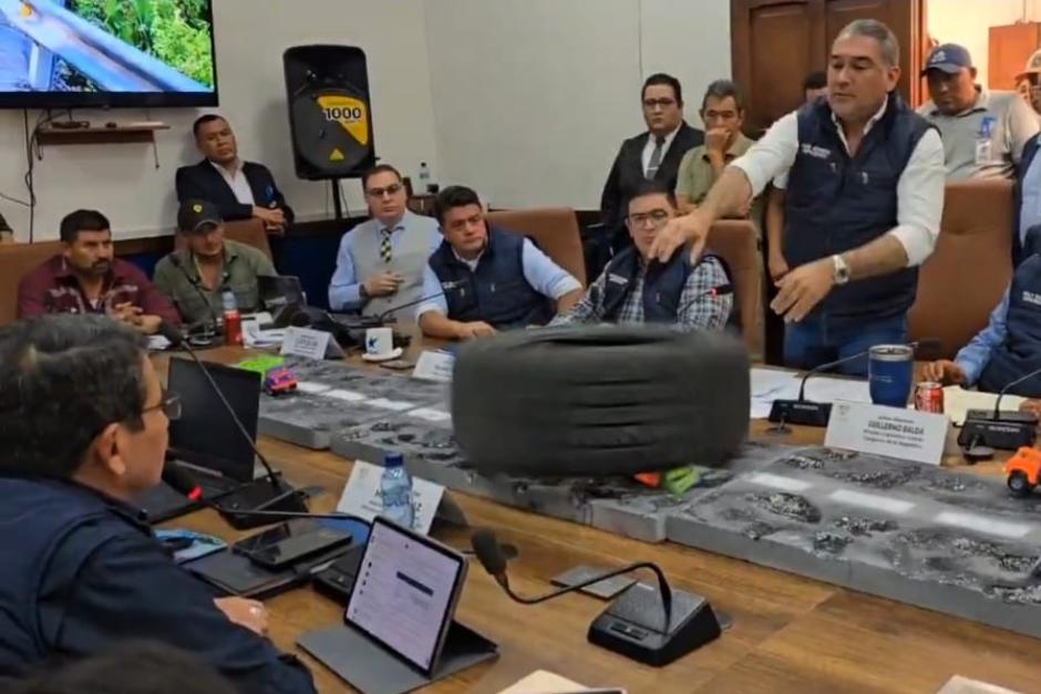 Pero en el transcurso de la discusión, el jefe de esa bancada, Luis Aguirre, elevó el tono y sacó una llanta, que lanzó directamente hacia el ministro, mientras le recriminaba por los daños que, según dijo, sufren los vehículos al transitar por carreteras en mal estado.