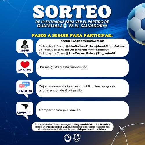 VAMOS APOYAR A LA SELECCIÓN DE GUATEMALA Ponemos a disposición 10 entradas que serán sorteadas para los jalapanecos para ir apoyar a la selección de Guatemala VS El Salvador también se pondrá bus para los ganadores El sorteo se realizará el próximo domingo a las 7 de la noche, les deseamos suerte Requisitos para participar 1- Ser Jalapanecos 2- Dejar tu comentario de apoyo a la selección 3- Compartir esta publicación ✅ 4- Seguir esta página y la de Lito Castro ♂️ Vamos juntos al estadio para apoyar nuestra selección