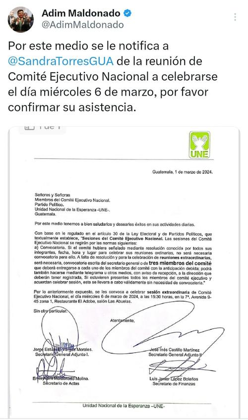 Por medio de su cuenta de X (Twitter), el diputado y secretario de actas de la organización, Adim Maldonado, compartió una convocatoria y notificó a la secretaria general, Sandra Torres.