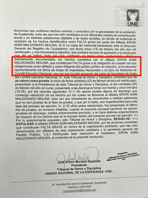 Cabe destacar que la tarde del lunes 4 el partido divulgó un documento en el cual consta que el Tribunal de Honor expulsó de manera definitiva a Adim Maldonado, acusándolo de una falta grave a los estatutos de la organización.