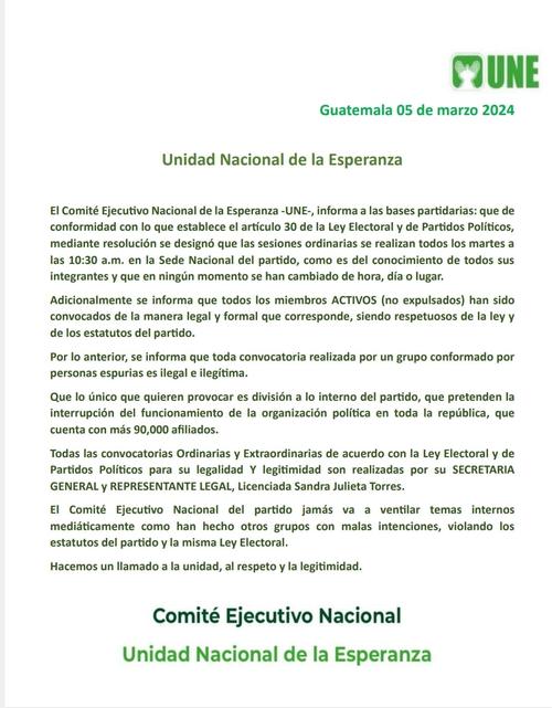 Cabe destacar que el llamamiento a esa junta está firmada por cuatro miembros del Comité Ejecutivo Nacional de la UNE, que ya no son afectos a Sandra Torres: