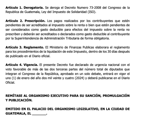 La propuesta es derogar el Decreto 73-2008 con la cual se creó el impuesto y que esta derogatoria cobre efectos a partir de enero de 2024.