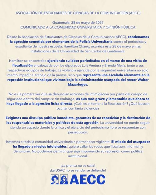 La Asociación de Estudiantes de Ciencias de la Comunicación de la Usac, rechazó la agresión en contra del periodista.