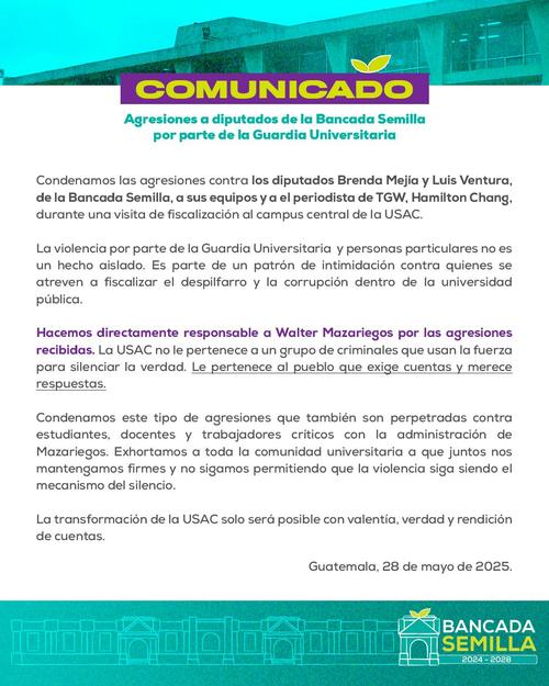 En un comunicado de prensa, informaron que la guardia de la Usac estuvo involucrada en la agresión en contra de los diputados.