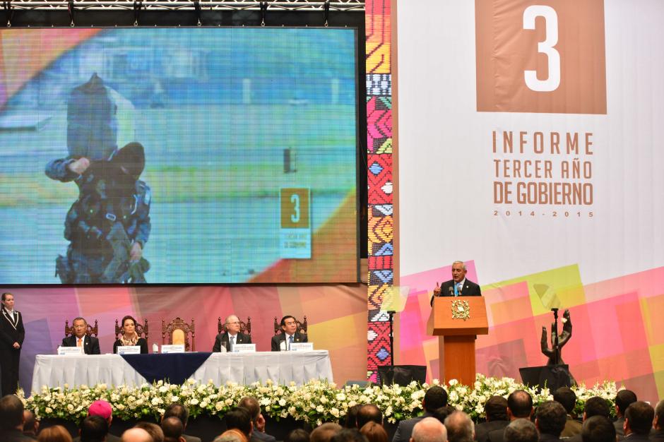 El Presidente Otto Pérez Molina habló por más de 50 minutos con la ayuda de dos monitores por donde corría el texto de su discurso, para rendir el Tercer Informe de su gestión. Hizo pausas intencionadas para permitir que lo apluadieran, usó frases repetitivas como si se tratara de un eslogan de campaña, y destacó como logros el combate contra el hambre, la estabilidad económica y la reducción de la violencia, entre otros. Resumimos en 12 puntos relevantes, y a la vez cuestionables, la rendición de cuentas del mandatario.