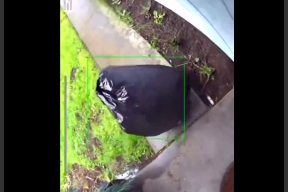 En las imágenes se observa que se acerca una persona, pero no se le ve el rostro ni el cuerpo, porque usa una bolsa de basura para cubrirse totalmente y así pasar desapercibida.