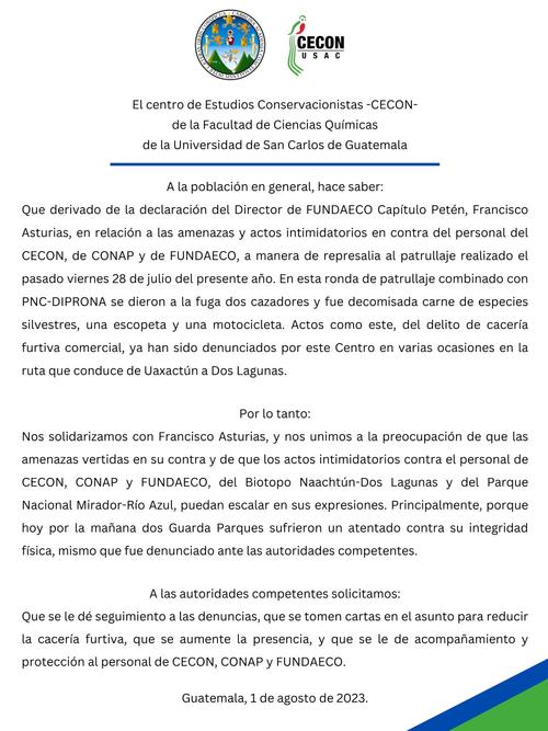 "Nos unimos a la preocupación de las amenazas vertidas en contra (de Francisco Asturias) y de que los actos intimidatorios contra el personal de Cecon, Conap y Fundaeco, del biotomo Naachtún-Dos Lagunas y del Parque Nacional Mirador-Río Azul, puedan escalar en sus expresiones", indicaron a través de un comunicado.