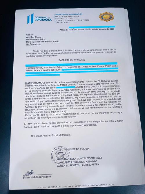 Según la denuncia interpuesta en la Policía Nacional Civil (PNC), las víctimas iban a bordo de su cuatrimoto, cuando al llegar a cercanías de la aldea Uaxactún, en Petén, unas personas se encontraban escondidas en unos matorrales les efectuaron disparos con arma de fuego.