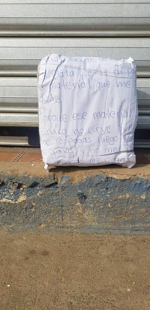En el mensaje que fue dejado en la caja se lee: "Mira Elías me devolves la plata que te di por el material que me diste. Porque ese material shuco no cirve (sic) sino me lo pagas, luego ya si ganas y no me has pagado me pagas".
