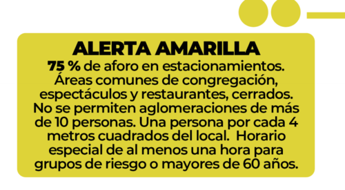 En esta alerta, se permitirá el 75% del aforo en estacionamientos, las áreas comunes de congregación, espectáculos y restaurantes seguirán cerrados. "No se permiten aglomeraciones de más de 10 personas. Una persona por cada 4 metros cuadrados del local. Horario especial de al menos una hora para grupos de riesgo o mayores de 60 años".