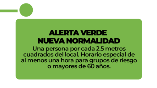 Como ya se ha indicado en otras ocasiones, la alerta de color verde significa la "nueva normalidad" y se permitirá la apertura de los centros comerciales. "Una persona por cada 2.5 metros cuadrados del local. Horario especial de al menos una hora para grupos de riesgo o mayores de 60 años.