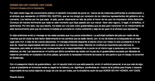 El cantautor guatemalteco Ricardo Arjona, anunció, en un comunicado publicado en su página oficial, que debido a los "hechos por los que atraviesa del país "devolverá irrevocablemente la "Orden del Quetzal", otorgada el 21 de marzo de 2013 por las autoridades, que actualmente son acusadas actos de corrupción.