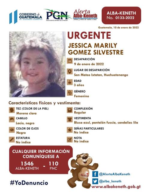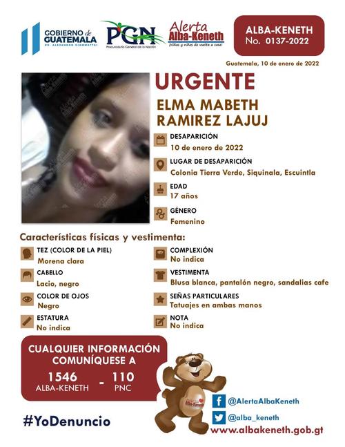 Ambas fueron vistas por última vez en Tierra Verde, Siquinalá en Escuintla. Entre las señas particulares de la menor de 17 años son tatuajes en ambas manos, de acuerdo con las características brindadas para su reconocimientos. Mientras que la más pequeña cuenta con una cicatriz de quemadura en el pecho.